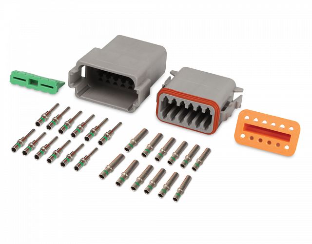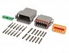 Environmentally sealed connectors rated at -55° to 125°C. Supplied with nickel plated copper alloy crimp contacts, locking wedges and large I.D. removable contacts, 1.9mm in diameter. Plug and socket kits come complete with terminals and seals. Supplied with 24 nickel plated copper alloy crimp contacts and 2 locking wedges.