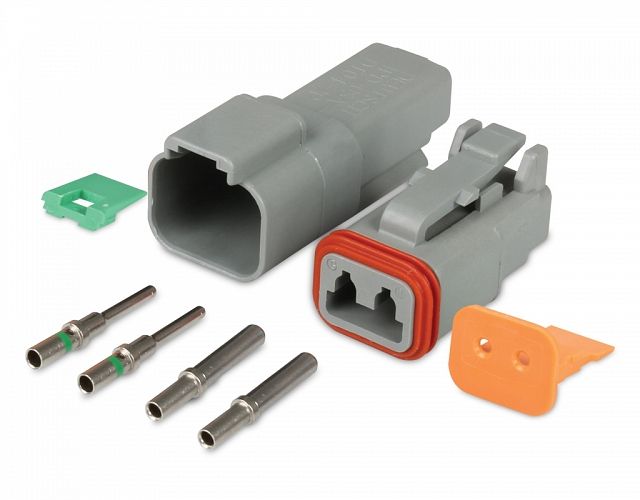 Environmentally sealed connectors rated at -55° to 125°C. Supplied with nickel plated copper alloy crimp contacts, locking wedges and large I.D. removable contacts, 1.9mm in diameter. Plug and socket kits come complete with terminals and seals. Supplied with 4 nickel plated copper alloy crimp contacts and 2 locking wedges.