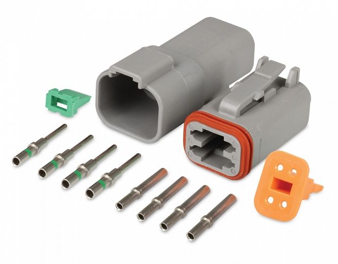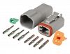 Environmentally sealed connectors rated at -55° to 125°C. Supplied with nickel plated copper alloy crimp contacts, locking wedges and large I.D. removable contacts, 1.9mm in diameter. Plug and socket kits come complete with terminals and seals. Supplied with 8 nickel plated copper alloy crimp contacts and 2 locking wedges.
