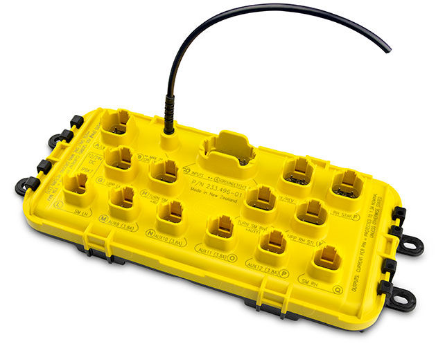 HELLA’s revolutionary LED Lamp Distribution Box has been upgraded to include four high current outputs to allow connection of higher power reversing lamps, work lamps and other equipment. The distribution box is designed with integrated DT connector sockets to provide a quick connect, easy trouble shooting solution for fitting LED lamps to heavy trailers and custom vehicles. Internal electronics isolate individual circuits and reduce lamp outage to ensure a long life and reliable lamp operation. A completely sealed housing and durable materials provide protection against water, dust and high pressure/steam jet cleaning. |