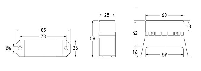Black plastic housing with transparent snap-fit lid. Flat plug connections.