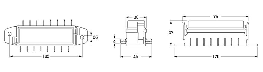 Black plastic housing with transparent snap-fit lid. Flat plug connections.