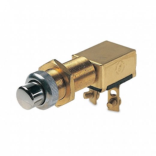 Momentary Spring Return Push Button Starter Switch. Brass construction. Chrome plated face nut and button.
