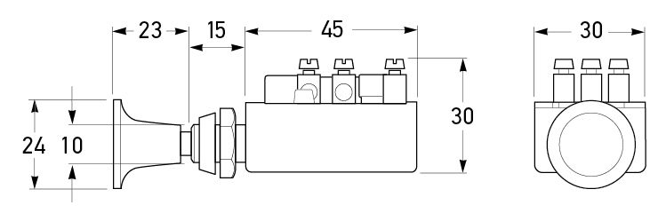 Three position headlamp switch without pilot lamp. Features black grip and 20 amp glass fuse.