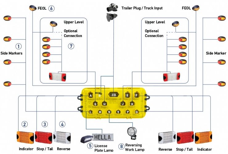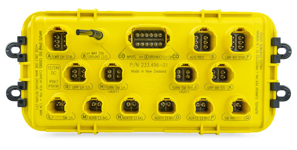 HELLA’s revolutionary LED Lamp Distribution Box has been upgraded to include four high current outputs to allow connection of higher power reversing lamps, work lamps and other equipment. The distribution box is designed with integrated DT connector sockets to provide a quick connect, easy trouble shooting solution for fitting LED lamps to heavy trailers and custom vehicles. Internal electronics isolate individual circuits and reduce lamp outage to ensure a long life and reliable lamp operation. A completely sealed housing and durable materials provide protection against water, dust and high pressure/steam jet cleaning. |