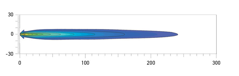 Comet 450 Spread Beam distance. Recorded with single lamp. Distance in metres.