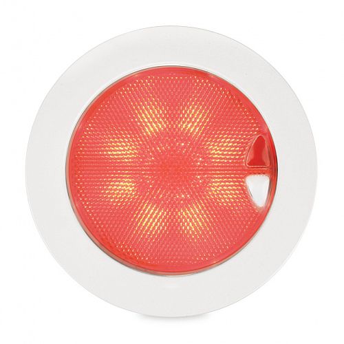 Available in white or warm white/red light and white plastic or stainless steel rim