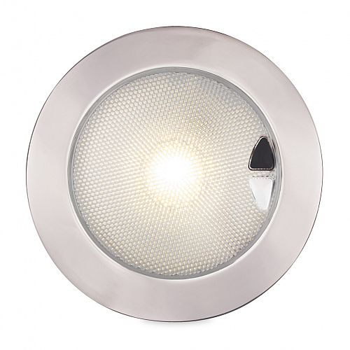 Available in white or warm white/red light and white plastic or stainless steel rim. Clear lens.