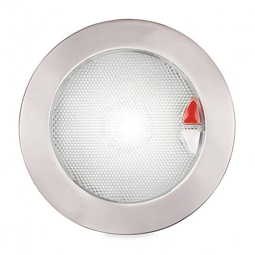 Available in white or warm white/red light and white plastic or stainless steel rim