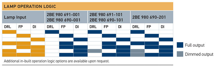 Direction indicator optic appears clear until illuminated. Each of the lamp versions has different in-built operation logic that are defined to suppress the DRL during the indicator flasher cycle and suit most vehicle installations with or without an additional DRL feed.