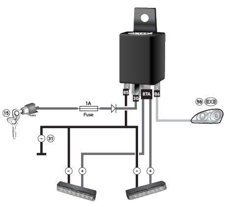 A control unit that dims the light output of the 15° and 30° LED daytime running lamps to front position/park function level.