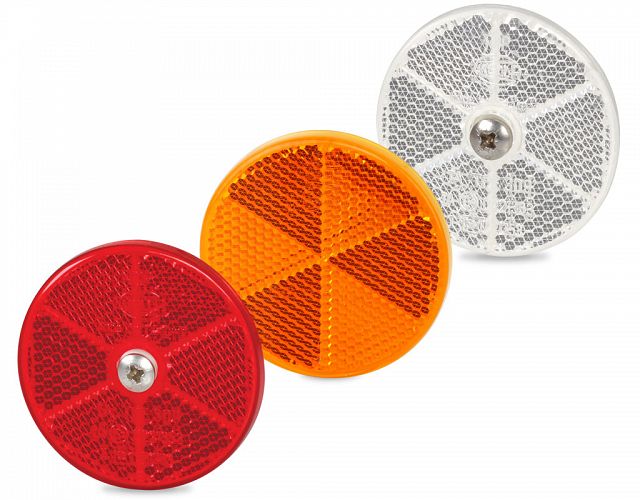 Retro reflector 60mm in diameter complete with mounting screw, 22cm2. Reflectors with self adhesive are ECE certified.