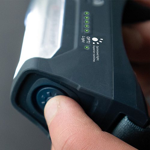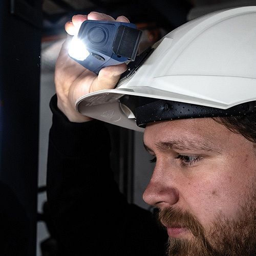 The lightweight (100g) ergonomically designed inspection headlamp features a stepless dimmer function from 10% (40lm) to 100% (400lm) light output. A user-friendly battery indicator provides convenient visibility of the remaining battery life.