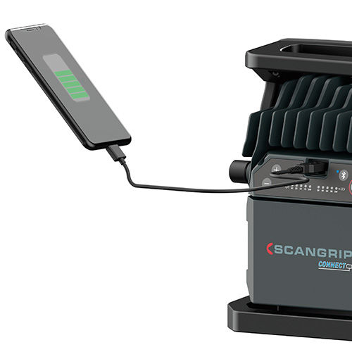 NOVA 10 CONNECT work lamps provide 10000 lumen of light, and feature an integrated carry handle, display for battery capacity and lumen output level, built-in battery backup and USB powerbank, a Bluetooth app for remote control of up to 4 lights, support SCANGRIP TRIPOD mounting, and have an IP65 weatherproofing rating.