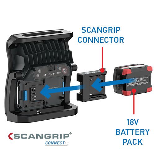 Select the SCANGRIP CONNECT work light that fits your needs, attach the CONNECTOR for your preferred battery brand, connect your battery, and you are ready to work! A built-in Battery Safety System ensures both correct operation of the battery and protects the battery pack in use.